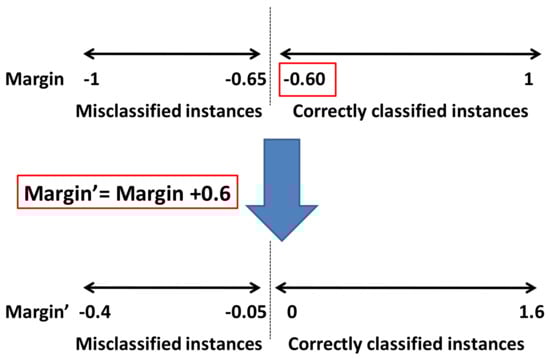 To solve the problem previously mentioned related to the margins (both supervised and unsupervised) based on a sum operation, a shift is performed before data importance calculation. The shifted margin values are achieved by subtracting the minimum margin value of the samples of the training set which are correctly classified from their original margin values. An example is used to explain the margin shift procedure in Figure 2.