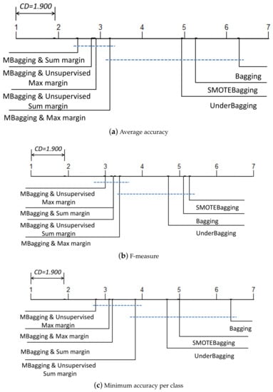 UnderBagging was first proposed by Barandela et al. []. In this method, the number of the majority class examples in each bootstrap sample is randomly reduced to the cardinality of the minority class. Simple versions of undersampling combined with bagging are proved to work better than more complex solutions such as EasyEnsemble and BalanceCascade [,,]. Another popular extended version of bagging is Roughly Balanced Bagging (RBBag) []. It results from the critics of the original UnderBagging algorithm and its variants which use exactly the same number of majority and minority class examples in each bootstrap sample. Instead of fixing a constant sample size, RBBag equalizes the sampling probability of each class. For each iteration, the size of the majority class in the bootstrap sample is set according to the minority class binomial distribution. The class distribution of the resulting bootstrap samples may be slightly imbalanced and it varies over iterations. This approach is more consistent with the nature of the original bagging and better uses the information about the minority examples. Both under-sampling bagging extensions outperform SMOTEBagging and OverBagging for binary class imbalance problems in []. However, the performances of the two methods were not tested for multi-class imbalance learning.