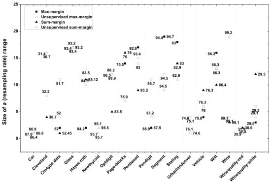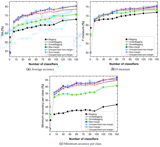 In all our experiments, Classification and Regression Trees (CART) are used as base classifiers for training all the classification models. Standard Bagging [] is utilized to obtain the margin values of training instances. All the ensembles are implemented with 100 trees. Each data set has been randomly divided into two parts: training set and test set. In order to avoid the case that all the minority class instances are in the training set (or test set), and there are no samples of the smallest class in the test set (or training set), the percentage of the instances used for training and testing is set to 1:1, i.e., 50% original data is obtained via adopting random sampling without replacement to form a training set, and all the unselected instances compose a test set. All the reported results are mean values of a 10-time calculation. The range of sampling parameter a is set to 10–100.