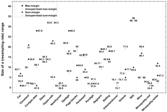 Different definitions of ensemble margin have been proposed [,,,]. The decision by an ensemble for each instance is made by voting. The ensemble margin can be calculated as a difference between the votes according to two different well-known definitions [] in both supervised [] and unsupervised [] ways.