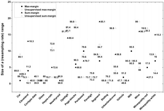 Let us consider a training set denoted as , where is a vector with feature values and is the value of the class label. The importance of a training instance could be assessed by an importance evaluation function which relies on an ensemble margin’s definition and is defined by Equation (5). The lower the margin value (in absolute value), the more informative the instance is and the more important it is to consider for our imbalance sampling scheme.