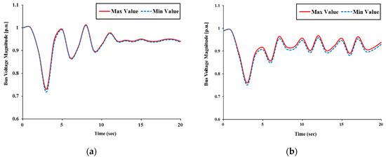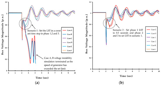 As it checks whether the voltage has been stably recovered or not, the LSA and LST are changed. To ensure short-term voltage stability, load shedding should be completed within 1.5 s after the fault. For this purpose, to select the LST, the maximum time is set to 1.5 s and the minimum time to 0.9 s. Phase-1 LSA and LST are selected, as LST is increased from 0.3 s, pursuing the lowest LSA and shortest LST. Figure 7 shows that the bus voltage recovery depends on LSA and LST.