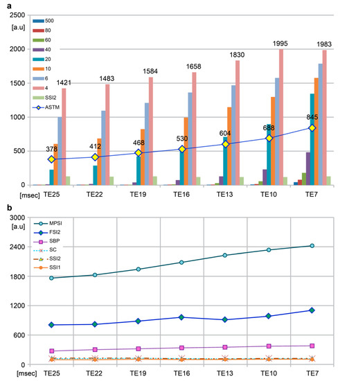 We also conducted a clinical study for direct comparisons with brain images, and obtained the following results. First, as seen in Figure 6, the GBCA signal enhancement at low concentrations was visibly increased in the clinical phantom as TE was decreased. Indeed, the ASTM graph in Figure 7a demonstrates increasing SI with decreasing TE. In order to compare the free water SI of saline in the clinical phantom and CSF in the body, we produced the graph in Figure 7b. Little difference was observed between the values at all TEs, with both measures varying in the range 120–130 a.u. In other words, the SI in free water was similar in the clinical phantom to that in the body. The SI in the brain parenchyma was higher than in free water, as shown by the SBP in Figure 7b, and FSI2 was even higher than SBP. Here, SBP and FSI2, with a constant molecular weight, showed an increase in signal with decreasing TE, whereas there was little change in the CSF signal.