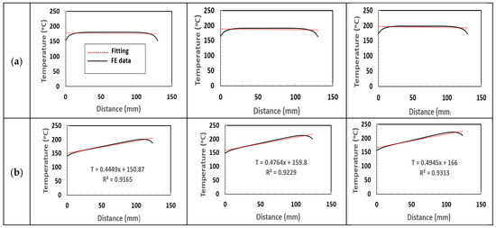 Curve fitting of temperature data obtained by finite element analysis. (a) Uniform, (b) Linear, (c) Quadratic, (d) Quartic.