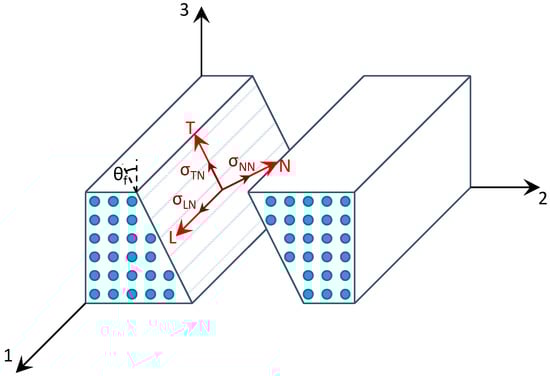Therefore, the stress components in the general fracture plane L-N-T oriented with a fracture angle θf, as in Figure 1, can be obtained as a function of the stress components defined in the lamina coordinate system 1-2-3: