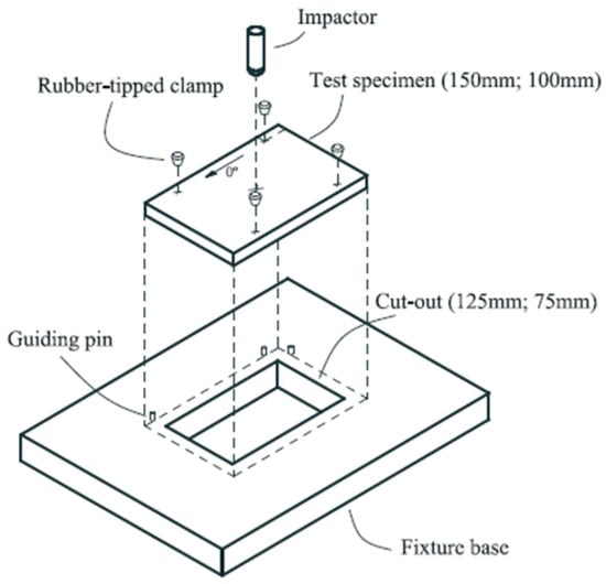 The experimental impact test was performed according to the ASTM D7136 standard [], as shown in Figure 3.