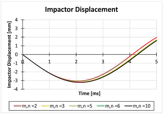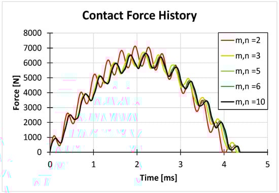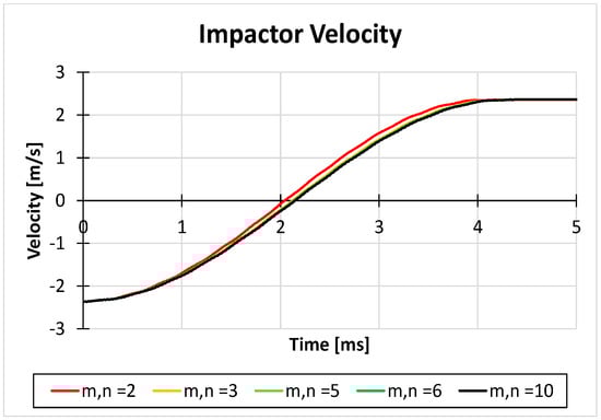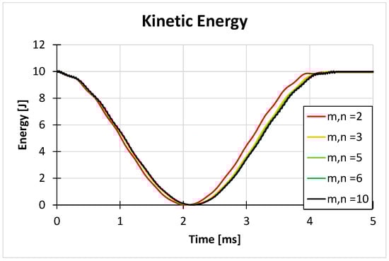 Figure 4 and Figure 5 highlight that lower values of m and n results in higher values of stiffness. Indeed, increasing the m and n values led to a decrease of the peak force and to an increase in the maximum deflection of the plate central point. Additionally, according to Figure 4 and Figure 5, the panel response in terms of impact force and maximum deflection tended to converge as the values of m and n increased. Figure 6 shows the trends of the impact velocity considering different m and n values. Although the velocity had the same initial and final values, different m and n led to different velocity trends. Moreover, as a direct consequence of the variation of the impact velocity, the kinetic energy, shown in Figure 7, showed different behavior when low values of m and n were considered. However, as m and n increase, the graphs shown in Figure 4, Figure 5, Figure 6 and Figure 7 appear to be perfectly overlapped.