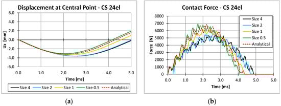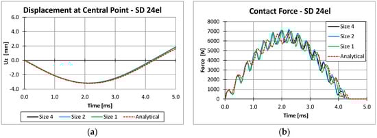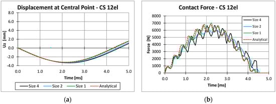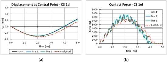 In Figure 9, Figure 10, Figure 11, Figure 12 and Figure 13, the numerical and analytical results, in terms of displacement of the impactor and contact force, are compared. In particular, the results shown in Figure 9 were obtained by using a shell element formulation, while the results in Figure 10, Figure 11 and Figure 12 were obtained by using a continuum shell formulation considering, respectively, 1, 12, and 24 elements in the thickness direction. Finally, in Figure 13, the results obtained by using a solid element formulation, with 24 elements in the thickness direction, are introduced.