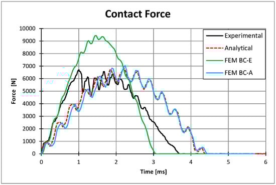 In Figure 15, a comparison between experimental, analytical, and numerical results, in terms of force as a function of the time, is reported. The comparison shows that in the first part of the curve both numerical and analytical models were in agreement with the experimental results. However, after a first phase, the analytical model and the FEM BC-A numerical model greatly differed from the experimental result. On the other hand, the FEM BC-E numerical model was characterized by the same mechanical response in terms of stiffness of the laminate, up to the maximum force peak. Indeed, neglecting the damages in the numerical model resulted in grater force peak, if compared with the experiment. Once the accuracy of the numerical model, in terms of elastic response, was established, the numerical models which provided the best results compared to the analytical solution was considered for the final impact test: final Continuum shell model and Final 3D solid model. Since Abaqus does not provide any intra-laminar damage models for Solid elements, a VUMAT was introduced. On the other side, Abaqus built-in Hashin’s criteria were used for model discretized by means of Continuum shell elements. For both the final continuum shell model and the final solid FEM model, gradual material properties degradation rules have been adopted for intra-laminar damage progression and inter-laminar damage were implemented through cohesive elements layers placed at plies interfaces.