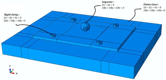 Despite their simplifications, the analytical models available in the literature well describe the behavior of a CFRP plate subjected to impact loading conditions. Hence, the numerical model was validated by comparisons with the analytical one, and the used modeling approach, neglecting in this preliminary phase the damages, has been assessed. Once the accuracy of the impact numerical model is verified, some considerations should be made about the relevant difference between the boundary conditions implemented in the analytical model and the ones implemented in the experimental test. Actually, simply supported conditions have been considered in the analytical and preliminary numerical models; however, the boundary conditions of the experimental test, suggested by the ASTM standards and reported in Figure 14, are substantially different. These boundary conditions are a consequence of a support fixture whose degrees of freedom are restrained and four rigid clamps, also modeled as rigid bodies, which hold the specimen still during impact and avoid any rebound.