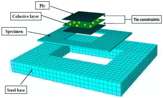 For 3D solid elements, the intra-laminar damage model introduced in Section 2.2 was applied by means of a VUMAT. Moreover, since the inter-laminar damages are likely to occur only between plies with different fiber orientation, zero-thickness cohesive layers were placed only in these locations. As highlighted in Figure 17, cohesive layers were connected to the adjacent layer by means of tie-constraint. Table 2 reports the mechanical properties of the cohesive material system, which were experimentally evaluated by means of three-point bending (En, Et, Es), double cantilever beam (Nmax, GIc), and end notched flexure tests (Tmax and Smax, GIIc and GIIIc).