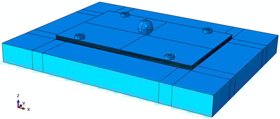 This Final Solid model was created by introducing two different meshed areas connect by a global–local conditions. Indeed, in the specimen impacted area, where most of the damage is supposed to develop (Figure 16) a ply-by-ply refined discretization was considered with each ply represented by a single layer of 3D solid elements C3D8R with a reduced integration scheme. On the contrary, the external global domain has been modeled with a coarser continuum shell mesh. With this discretization scheme, an accurate study can be performed by reducing, at the same time, the computational effort [].