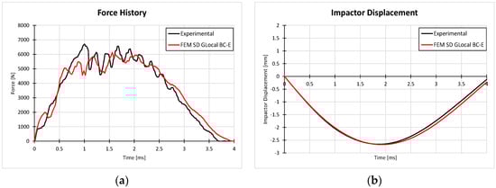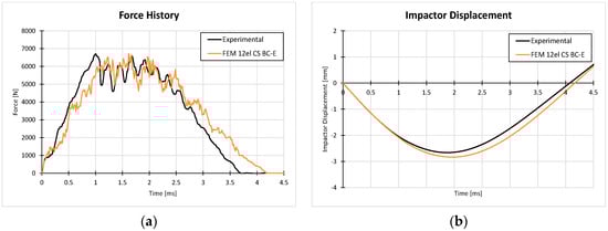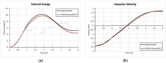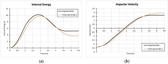 According to Figure 22a, the numerical curve deviates from the experimental one at about 0.3 ms due to anticipated numerical prediction of the onset of delaminations, resulting in a longer contact duration. This effect can be due to the lower number of interfaces. Moreover, the numerically overestimated impactor displacement (6.77% as reported in Figure 22b) and the underestimated residual internal energy of the numerical model (−28.52% as reported in Figure 23a), confirm the over-prediction of damages observed in the simulation. Hence, in the adopted numerical model, significant differences can be observed between the numerical and experimental inter-laminar and intra-laminar damages, as shown in Figure 20 and Figure 21. In particular, the stiffness of the continuum shell element is underestimated if compared with experimental results. Indeed, the maximum displacement of the numerical result is lower than the experimental result in conjunction with a lower peak force.