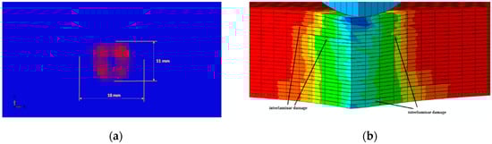 Figure 24 shows a good agreement between the predicted numerical delaminated area (267 mm2) and the experimental one. Moreover, the delaminations through the specimen sections are reported in Figure 27b. A good agreement between numerical and experimental results has been reached in terms of displacement-time, energy-time, and impact velocity-time as highlighted in Figure 28a,b and Figure 29b. The numerical model with solid element approach is able to predict with good approximation the maximum peak force, with a deviation of −8.90% with respect to the experiment, although it is not able to accurately predict the entire load history. Moreover, the proposed numerical model better predicts the maximum displacement (deviation of 0.37%) and reproduces the overall stiffness of the whole plate. According with Figure 29a, a good correlation in terms of internal energy vs time has been reported. In particular, the solid model compared to the shell one reproduces, in a good way, the amount of energy dissipated in the form of friction, viscosity, and especially due to breakages, is better computed by the solid model (−15.41%) respect to the shell one (−28.52%).