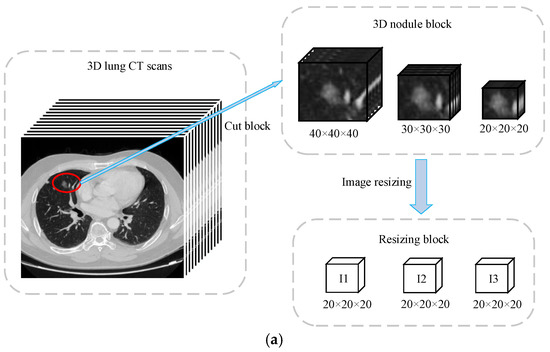 In the data preprocessing stage, we extracted , , and blocks for each sample via the central coordinates of the candidate nodules and used the nearest neighbor interpolation to transform them all into blocks. We used minimum–maximum normalization to ensure the algorithm converged faster by adjusting the data distribution of the sample. The intensities of the blocks were cut to [−1000, 400] Hounsfield units (HU)2 and normalized to [0, 1].