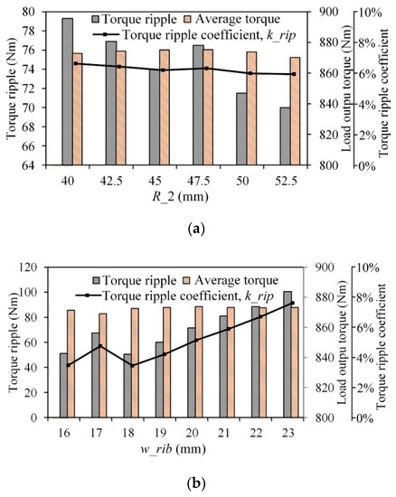 - As shown in Figure 8a, the average torque changed slightly with the variation of R2. Thus, the influence of R2 on the torque output capabilities was negligible. However, the torque ripples and thus krip varied greatly with R2. When R2 was 52.5 mm, the output torque ripple was the smallest and tended to be stable, with a value of 70 Nm and a krip of 5.8%, which is acceptable in heavy-load traction vehicles.