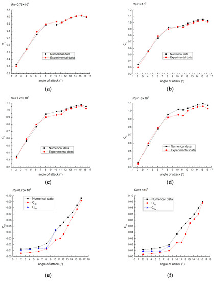 The computed pressure coefficient (Cp) distributions are compared with the experimental data [23] in Figure 4 for several angles of attack at Re = 1 × 106. As can be seen, they are in excellent agreement, which means that the separation points can be well predicted.