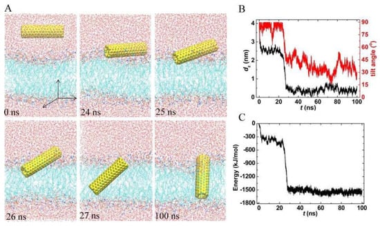 A typical trajectory of pristine carbon nanotubes (PCNT) entering the membrane. (A) Snapshots at critical times. (B,C) Time evolutions of the center of mass (COM) distance in the z-direction, the tilt angle, and the interaction energy between PCNT and membrane.