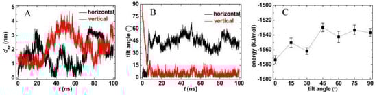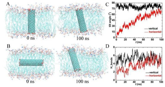 Trajectories of functionalized carbon nanotubes (FCNT) located in the membrane vertically and horizontally. (A,B) Snapshots at t = 0 ns and 100 ns, (C) the tilt angle, and (D) the hydrogen bonds between FCNT and lipid bilayer.