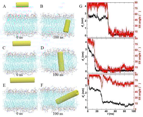 To explore the effects of CNT length on its insertion into the lipid membrane, we performed three additional independent simulations, with different lengths of PCNTs, namely, 2.4 nm, 3.6 nm, and 4.8 nm, which are shorter or close to or longer than the bilayer thickness. As shown in Figure 3, the spontaneous insertion of PCNTs in the lipid bilayer was robust, independent of the lengths of PCNTs (see snapshots at t = 100 ns). Shorter PCNTs with lengths less than the thickness of the bilayer underwent significant rotation during the insertion and preferred to reside in the bilayer center vertically (Figure 3B, D). The tilt angles fluctuated slightly at 10°. It should be pointed out that the final orientations of PCNTs were related to their initial structures. With the increasing lengths of PCNTs, the rotation became more and more difficult, as longer PCNTs were prone to be confined at local minima, similar to the simulation results of PCNT initially embedded in the bilayer center horizontally (Supplementary Material, Figure S1). That is, the PCNT always lay flat in the membrane (Figure 3F). Correspondingly, the tilt angle was kept stable at 68°.