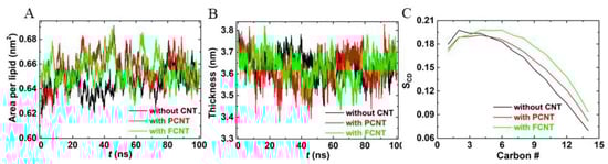 The effects of carbon nanotubes (CNT) on the membrane structure compared with the pure bilayer. (A) Area per lipid, (B) the bilayer thickness, and (C) deuterium order parameter for a lipid chain.
