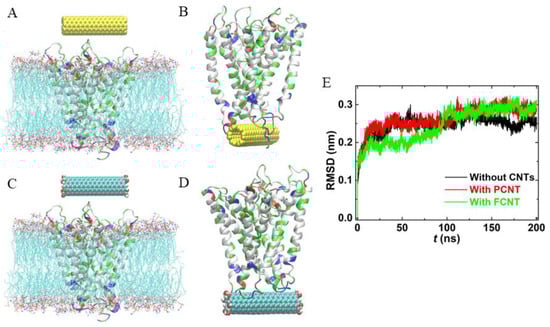 Then, we performed particular simulations to explore how inserted CNTs interact with existing membrane proteins. A potassium channel (K+ conduction and selectivity architecture, KcsA) was selected as a model membrane protein (PDB ID: 2A9H). Initially, the protein was embedded in the phosphoethanolamine (POPE) lipid bilayer, and CNTs were positioned at the aqueous phase, as shown in Figure 6A,C, and then the CNTs were released. Interestingly, it was found that the channel of KcsA was blocked by both PCNT and FCNT (Figure 6B,D). The blockage of the potassium channel may weaken the transport of Na+, K+, and so on, which further affects the transduction of nerve signals. Fortunately, CNTs exhibit considerable potential as artificial ion channels and possess selectivity after inserting the cell membrane. That is, this problem may be solved by CNTs themselves. Figure 6E gives the time evolution of the RMSDs of the backbone of KcsA with or without CNTs. We observe that the three root-mean-square-deviation (RMSD) curves are in line with each other except for a little difference in the last 50 ns, indicating that the secondary structure of KcsA had no distinct change exerted by inserted CNTs.