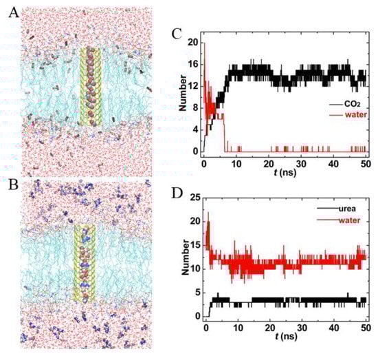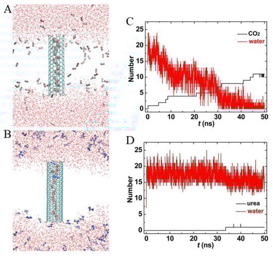 For comparison purposes, we also simulated the transport of CO2 and urea through FCNT, as shown in Figure 8. Though the hydroxyl groups at the entrance of FCNT improved its hydrophilicity, the interior of FCNT was still hydrophobic. Therefore, the inner FCNT was gradually occupied by CO2 molecules (see Figure 8A,B). The number of water molecules decreased from 25 to 2, correspondingly, that of CO2 molecules increased from initial 0 to 11 at t = 50 ns. Surprisingly, it became more difficult for urea to enter the FCNT. During the whole simulation, only one or two urea molecules appeared in the FCNT. On the other hand, the number of water in Figure 8C,D fluctuated more dramatically than that in Figure 7C,D. This was because the hydroxyl groups at the entrance of FCNT enhanced the interactions with water molecules.