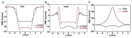Eventually, we computed the free energy of CO2 and urea across the two CNTs, depicted by PMF profiles in Figure 9. It was found that there was no energy barrier for CO2 at the entrance of both PCNT and FCNT. On the other hand, CO2 had lower free energy in the CNT (−20.4 kJ/mol for PCNT and −29.7 kJ/mol for FCNT) than in the lipid headgroups as well as in the water. As a comparison, the free energy of CO2 in the lipid bilayer was only −6.5 kJ/mol (Figure 9C), much higher than that in the CNTs, indicating that CO2 in the CNTs was energetically favorable. As to urea molecules, the PMF kept rising and reached the highest peak (approximate 50 kJ/mol) at the bilayer center, which is why urea molecules cannot permeate into the membrane. However, there was no energy barrier at the PCNT entrance, though urea molecules were accompanied by water molecules in the PCNT. However, the energy barrier at the FCNT entrance reached approximately 9.3 kJ/mol, due to the presence of the hydroxyl groups at the entrance of FCNT. Their electrostatic interactions with urea molecules prevented them from entering the FCNT.