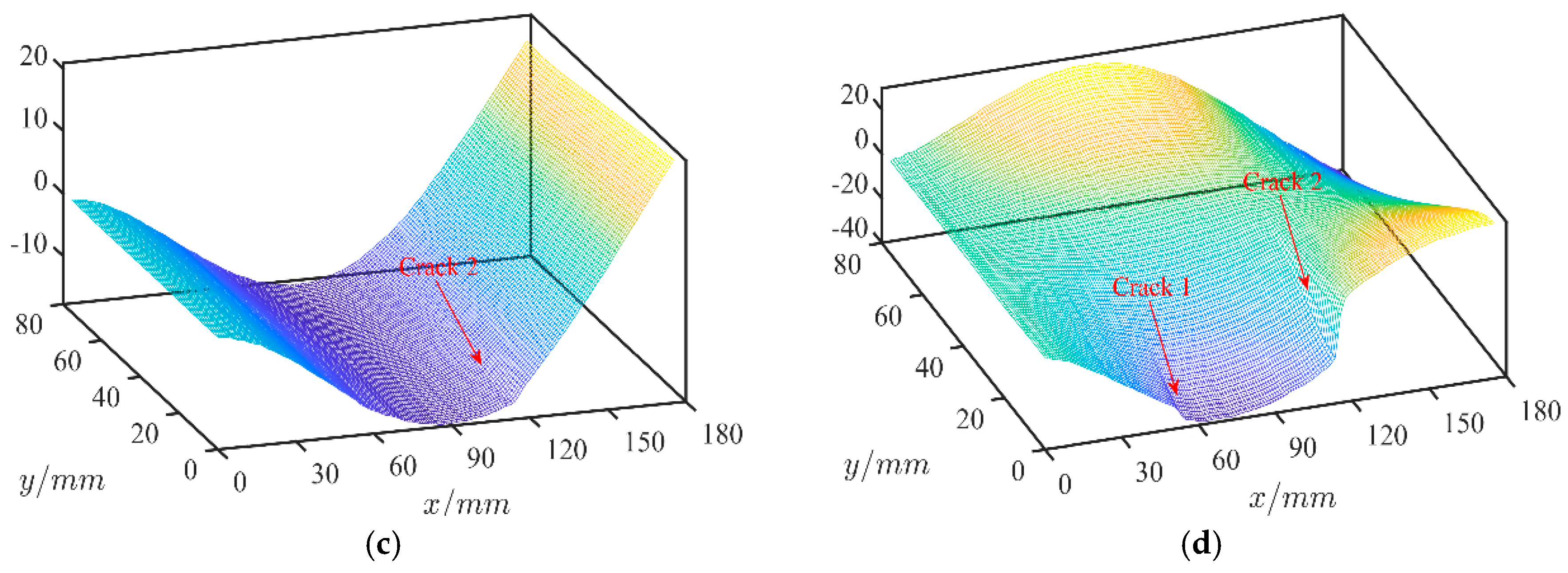 | Case 2 | Crack 1 & Crack 2 | 13 mm × 1 mm & 22 mm × 1 mm | 16.25% & 27.5% |
