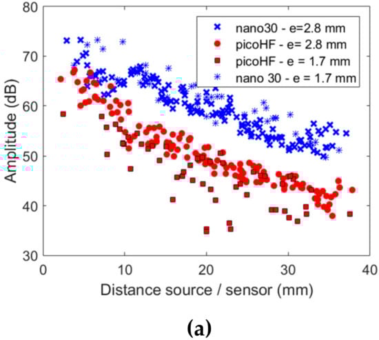 Descriptors vs. source/sensor distance for experimental signals and numerical signals detected by nano30 and PicoHF sensors: (a) amplitude in dB, (b) frequency centroid in kHz, e 2.8 mm and z = 0.9 mm.