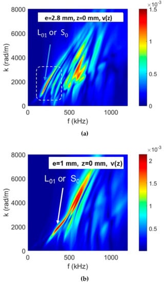 The thickness and the source position along the z-axis are varied. Figure 20a shows the results for the 2DFFT obtained with a virtual perfect point-like contact sensor for two values of the thickness (e = 2.8 mm and e = 1 mm), when the fiber is located in the mid-plane of the specimen. A comparison can be made with the Figure 18b. When the source is located in the mid-plane (z = 0), only the longitudinal (L01 in particular) or symmetrical modes are excited (Figure 20a). Even if the identification of the excited modes is complicated due to the reflections, we can observe that the excited modes are not the same. With decreasing the z-position, the spectral contributions above 500 kHz increase significantly.