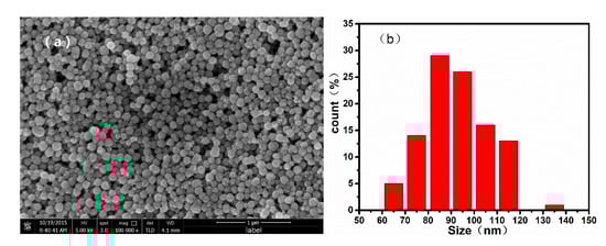 The room-temperature hysteresis loop of the nanoparticles was measured using a vibrating sample magnetometer (VSM). The magnetization curves of the samples are shown in Figure 4, and the magnetic parameters are listed in Table 2. All nanoparticle samples show excellent superparamagnetic properties with really narrow hysteresis loops. From Table 2, the remanent magnetization () of nanoparticles with a size of 100, 300, 500, and 700 nm was 3.34, 3.97, 3.26, and 4.28 emu/g, respectively. The saturation magnetization () of nanoparticles with a size of 100, 300, 500, and 700 nm was 72.14, 75.94, 80.28, and 85.41 emu/g, respectively. In this work, it was further found that the saturation magnetization () and the remanent magnetization () can be mildly affected by the size of nanoparticles.