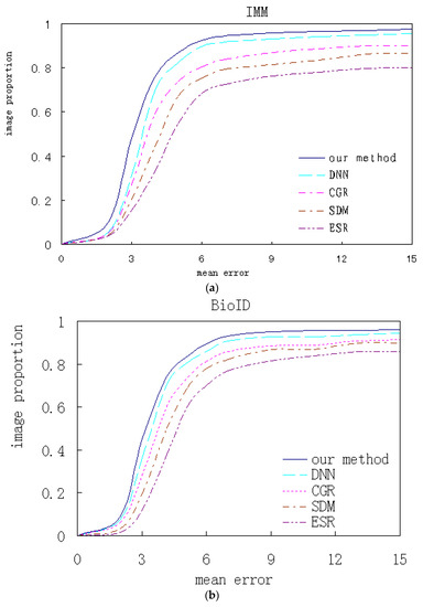 Our algorithm and the contrastive ones are respectively trained and test experiments are performed on several databases. The qualitative analysis and quantitative comparison based on the corresponding experimental results are shown. Figure 18 shows the cumulated error curves of different algorithms on different databases, where the x-coordinate indicates mean alignment error and the y-coordinate indicates test image proportion.