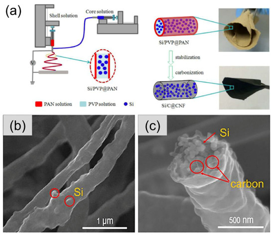Owing to the very high theoretical specific capacity of silicon (4200 mAh/g), carbon fibers with embedded Si nanoparticles (NPs) have received great attention as a possible solution to the rapid capacity fading caused by the pulverization of the bare silicon electrode due to its mechanical failure upon repeated Li insertion and extraction. In particular, Xu et al. [82] have designed flexible non-woven membranes consisting of electrospun silicon/carbon@carbon fibers (Si/C@CNFs). The fibers, fabricated by the use of a co-axial electrospinning configuration (Figure 8a), exhibit a core-shell structure (Figure 8b–e), where the external shell is constituted by PAN-derived carbon, and the internal core consists of well-dispersed Si NPs wrapped to PVP-derived carbon. The Si/C core acts as an efficient conductive network (Figure 8f), enabling the membranes with 40 wt% Si loading to deliver up to 1507 and 555 mAh/g at current densities of 0.1 and 2 A/g, respectively [82]. Thanks to the buffering action of the PVP-derived carbon protecting Si NPs from the mechanical damage, after 500 cycles at a rate of 0.2 A/g, the electrode retains 86% of the initial capacity.