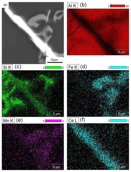 The Al–Si alloy, which accounts for 80% of the aluminum alloy market, has many advantages including excellent castability ratings, high fluidity, and good corrosion resistance, etc. However, it is difficult to branch into additional application fields, due to the coarse microstructures. The Al–Si alloys were strengthened by the additional metal elements, such as Tungsten [1]. Wu et al. [2] considered the effects that Sr additions had on the microstructures and the mechanical properties of Al3Ti/ ADC12 (Aluminum-Alloy Die Castings) composites. They found that when the Sr content increase to 0.25 wt.%, the coarse dendritic of the primary α-Al phases completely refines, and the acicular or short rod shape of the eutectic silicon changes into a granular shape. The mechanical properties are improved by the addition of Sr, where good UTS and breaking elongation were obtained. Studies [3,4,5,6,7] show that some rare earth (RE) elements play a role in modifying the Al–Si cast aluminum alloys. Song et al. [8] investigated the impact that La had on the microstructure and hot crack resistance of an ADC12 alloy. The morphology of the α-Al grain changes from a dendritic crystal into fine equiaxed or spheroidal crystals when the quantity of La reaches 0.6 wt.%, and the size of the eutectic silicon varies from the needle-like to a tabular shape into fine rod-like shape without edges and corners. During the modification process of rare earths, the performance of aluminum alloys change by the different rare earth elements or processing techniques. Studies show that the addition of rare earth minerals modify the Fe phase to less harmful forms for Al–Si alloys [9]. Rao et al. [10] investigated the effects that Sm additions had on the eutectic Si, β-Al5FeSi phases of the ADC12 as-cast alloy. When the Sm addition increased to 1.0 wt.%, the needle-like β-Fe modifies into the Chinese script or the spherical α-Fe phase.