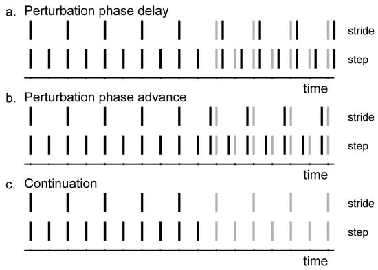 In each locomotion block, participants performed two tasks (Table 1): a synchronization-perturbation task (Figure 1a,b; [,,]) and a synchronization-continuation task (Figure 1c; [,]). During the synchronization-perturbation task, the participants were paced at a certain cadence. The auditory cues were provided to the participants as a sequence of metronome beeps. Beep duration was 0.05 s, including 0.005 s fading at the start and end of each beep to make them sound less mechanical. After one minute of adaptation and synchronization, 60° phase perturbations were introduced in the pacing signal (360° corresponds to one stride). There were four phase-delay (+60°; Figure 1a) and four phase-advance perturbations (−60°; Figure 1b), separated by 30 to 40 steps. The number of steps between perturbations and the perturbation direction were randomized to ensure that participants could not anticipate the perturbations. Participants were instructed to adjust their footfalls to the cues [,]. During the synchronization-continuation task, they were also paced at a certain cadence for one minute. Subsequently, pacing was removed for the final 90 s. Participants were instructed to maintain the imposed cadence (Figure 1c).