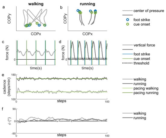 Example of representative data during stationary auditory-motor coordination. (a) The filtered (low-pass, second-order Butterworth filter with a cut-off frequency of 10 Hz) center of pressure (COP) for two seconds of walking for one participant. The blue circles indicate instants of foot strike and the green circles indicate cue onsets. (b) The filtered center of pressure (COP) for two seconds of running for one participant. The blue circles indicate instants of foot strike and the green circles indicate cue onsets (corresponding to panel d). (c) The vertical force data for the same two seconds of walking. The vertical blue lines indicate instants of foot strike and the vertical green lines indicate cue onsets (corresponding to panel a). (d) The vertical force data for the same two seconds of running. The vertical blue lines indicate instants of foot strike, defined as the moment in time when the vertical force crosses the threshold of 5% of the maximum vertical force (black dotted line). The vertical green lines indicate cue onsets. (e) The cadence for 100 steps of walking (light grey line) and running (dark grey line) and the corresponding (preferred) pacing frequencies (light green line for walking and dark green line for running) (f) The relative phase (ϕ) for 100 steps of walking (lighter grey line) and running (darker grey line). A positive relative phase indicates that the foot strikes are ahead of the cues.