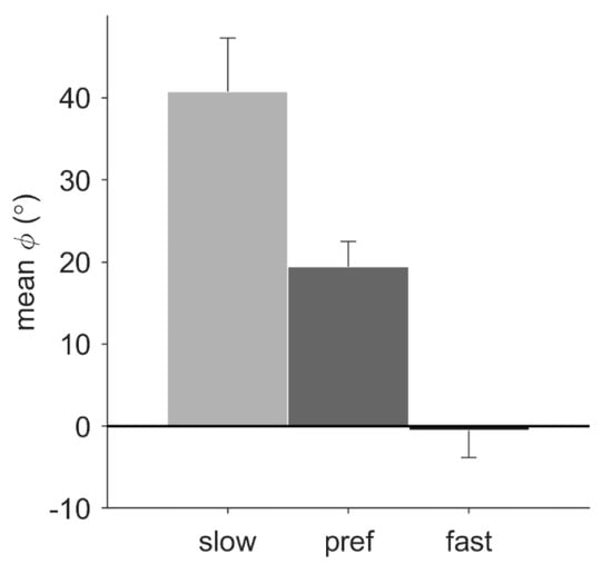 Mean relative phase (ϕ) during stationary auditory-motor coordination for walking with the different pacing frequencies (N = 11). Error bars represent the standard error of the mean.