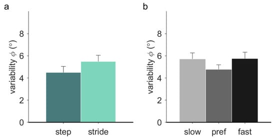 Variability of the relative phase was significantly higher with stride-based (5.48° ± 2.01°) than step-based pacing (4.50° ± 1.92°), F(1, 12) = 8.68, p = 0.012, ηp2 = 0.42 (Figure 4a). There was a significant effect of frequency on the variability of the relative phase in walking (F(2, 20) = 3.75, p = 0.042, ηp2 = 0.27). Post-hoc tests with Bonferroni correction revealed no significant individual differences between slow (5.72° ± 0.55°), preferred (4.78° ± 0.41°), and fast (5.75° ± 0.58°) pacing frequencies (Figure 4b). No significant effect of locomotion was found, nor any significant interactions.