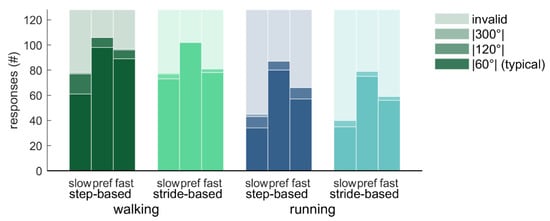 How often the different responses to the perturbations occurred varied across conditions (Figure 5 and Figure 6). Friedman’s ANOVA indicated that there were significant differences in the number of typical responses (|60°|) across conditions (Χ2(11) = 63.95, p < 0.001; Figure 5). Wilcoxon tests with Bonferroni correction were used to make specific comparisons. Participants had less typical responses for running (3.51 ± 1.98; out of 8 perturbations) than for walking (5.22 ± 2.11; T = 0, r = 0.88), and less typical responses for slow pacing frequency conditions (3.17 ± 2.11) than for preferred frequency conditions (5.55 ± 1.95; T = 1.5, r = 0.86). The number of typical responses did not differ between step-based (4.36 ± 1.96) and stride-based (4.36 ± 2.15) pacing conditions. Similar but opposite differences were found for the number of invalid responses (Χ2(11) = 63.88, p < 0.001; T = 0, r = 0.88; T = 1.5, r = 0.86, respectively; Figure 5).