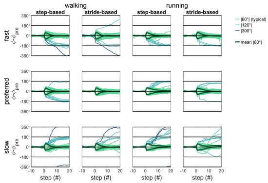 In sum, the purpose of the present study was to compare the effectiveness of step-based and stride-based pacing for modulating walking and running cadences. We expected more synchronization and more stable auditory-motor coordination with step-based pacing (stronger coupling) for both walking and running, reflecting a superior cadence-modulating effect [,]. As a reflection of this, we expected participants’ subjective experiences about the various types of cues to match objective synchronization, auditory-motor coordination and internalization findings in that participants would best rate the pacing type with the strongest coupling (i.e., step-based pacing). Furthermore, we expected more stable auditory-motor coordination with congruent pacing (i.e., pacing matching one’s preferred cadence), and decreasing phase leads with faster pacing. Finally, we expected a larger detuning-related deviation from the prescribed cadence after removal of the pacing signal in slow and fast pacing conditions, with a change of cadence towards one’s preferred cadence.