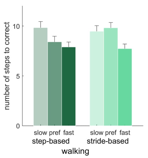 Average number of steps needed to correct after perturbations in walking (N = 12). Error bars represent the standard error of the mean.