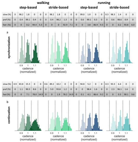 Histograms of the normalized cadence. (a) Synchronization phase. (b) Continuation phase. Vertical dotted lines represent the borders of the ranges around the slow (0.9), preferred (1.0) and fast (1.1) frequencies. The percentages of cadences falling in each frequency range are displayed above the figure for the three pacing frequencies separately. The data displayed belongs to the nine participants included in the constant error analysis for walking. As some of these participants did not synchronize in all conditions, displayed histograms were based on N = 7 for running with preferred step-based, and slow and preferred stride-based pacing conditions and N = 6 for the running with slow step-based pacing conditions.