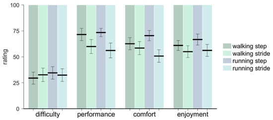 The results of the questionnaire are presented in Figure 9. Individual participant ratings are available in the Supplementary Materials. Participants rated their synchronization performance to be better for step-based (73.07 ± 17.00) than for stride-based pacing (59.37 ± 24.67; F(1, 14) = 6.06, p = 0.027, ηp2 = 0.30). They further rated comfort higher for step-based (66.47 ± 18.71) than for stride-based (55.13 ± 22.73) pacing (F(1, 14) = 4.97, p = 0.043, ηp2 = 0.26). Difficulty and enjoyment rates did not differ between step-based and stride-based pacing (p > 0.05). No significant differences in the ratings between walking and running were found, nor any significant interactions.