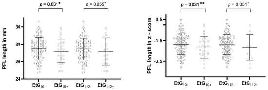 PFL length in millimeters and z-score for EtG 10 ng/g (EtG10+ n = 32) and 112 ng/g (EtG112+ n = 20) cut-off values. Higher PFL value = longer eyes. Univariate ANCOVA results: + p < 0.01, * p < 0.05, and ** p < 0.01.