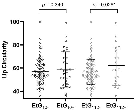 Lip circularity for the EtG 10 ng/g (EtG10+ n = 32) and 112 ng/g (EtG112+ n = 20) cut-offs. Higher lip circularity value = smaller upper lip size. Univariate ANCOVA results: * p < 0.05