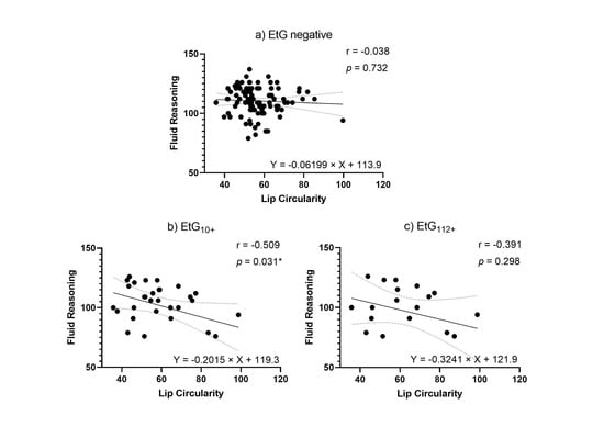 (a) Lip circularity versus fluid reasoning for EtG-negative individuals (10 ng/g cut-off, EtG-negative n = 97). (b) Lip circularity versus fluid reasoning for EtG10+ individuals (EtG10+ n = 32). (c) Lip circularity versus fluid reasoning for the EtG112+ (EtG112+ n = 20) cut-off. Higher lip circularity value = smaller upper lip size. * p < 0.05.