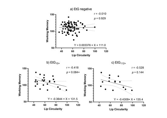 (a) Lip circularity versus working memory for EtG-negative individuals (the 10 ng/g cut-off, EtG-negative n = 97). (b) Lip circularity versus fluid reasoning for EtG10+ individuals (EtG10+ n = 32). (c) Lip circularity versus working memory for EtG112+ (EtG112+ n = 20) cut-offs. Higher lip circularity value = smaller upper lip size. + p < 0.10.