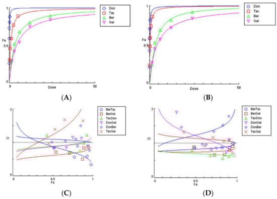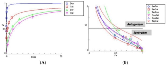 A CI plot of the different drug combinations against the fractional affect (Fa) 0.5 (IC50 values) revealed that for the first assayed point (0.25×), only TacDon, DonGal, and TacGal generated values close to the central line, in keeping with additive effects, whereas BerTac, BerGal, and DonBer effects were all synergistic. However, at higher drug concentrations, all of the tested combinations (BerTac, BerGal, TacDon, DonGal, DonBer, and TacGal) displayed synergistic effects (Figure 3B).