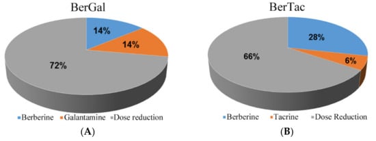 Virtual ChEI dual-drug combination pills: A virtual berberine and galantamine (BerGal) pill would have a 72% reduction of total drug dose (A). A virtual berberine and tacrine (BerTac) pill would have a 66% reduction of total drug dose (B).
